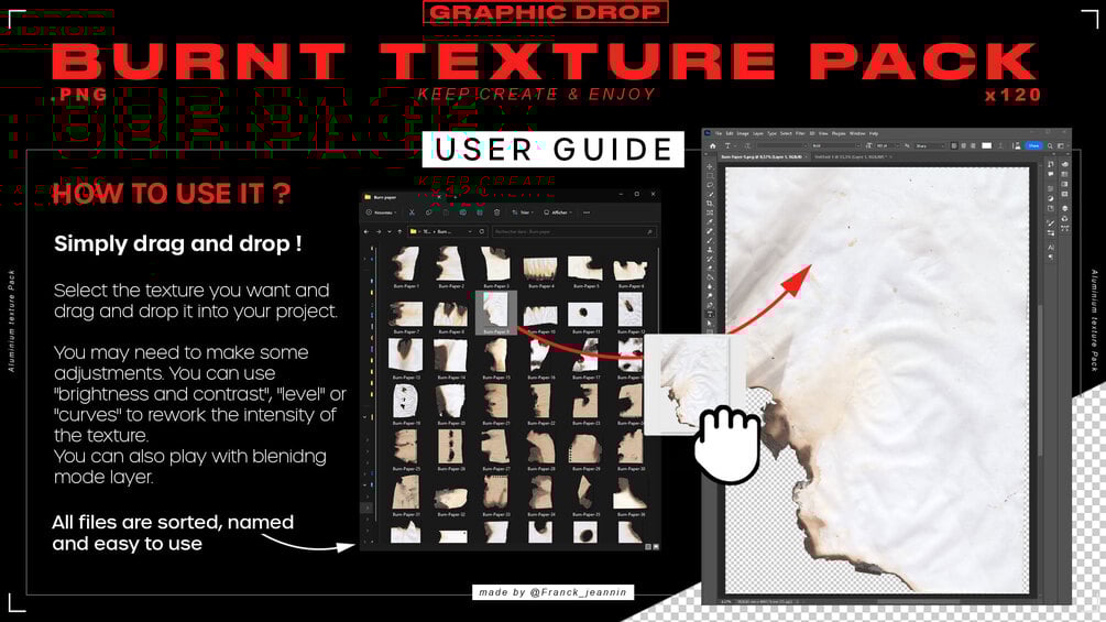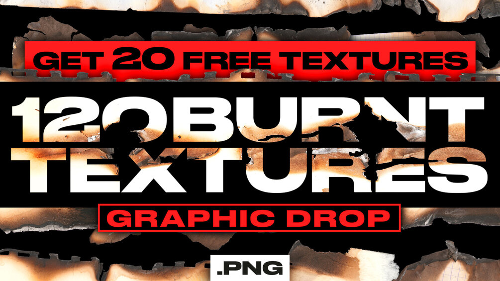 The Burnt Texture Pack, which includes 120 .PNG files of the highest quality. These burnt textures are perfect for any design project, with their transparent background it's easy-to-use with a simple drag-and-drop.