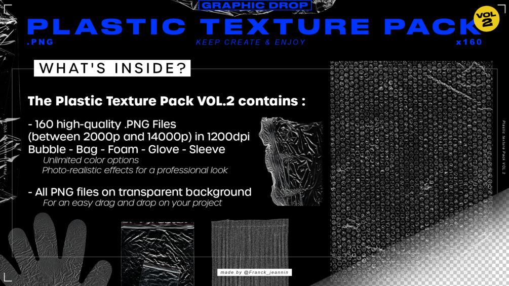 The Plastic Texture Pack, which includes 160 .PNG files of the highest quality. These plastic textures are perfect for any design project, with their transparent background it's easy-to-use with a simple drag-and-drop.