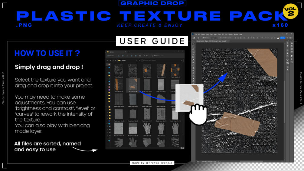 The Plastic Texture Pack, which includes 160 .PNG files of the highest quality. These plastic textures are perfect for any design project, with their transparent background it's easy-to-use with a simple drag-and-drop.