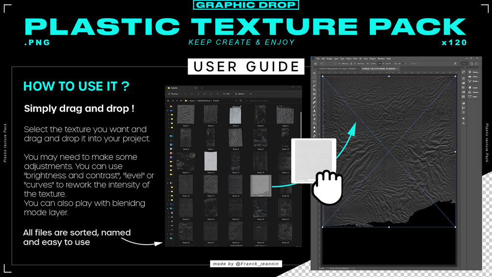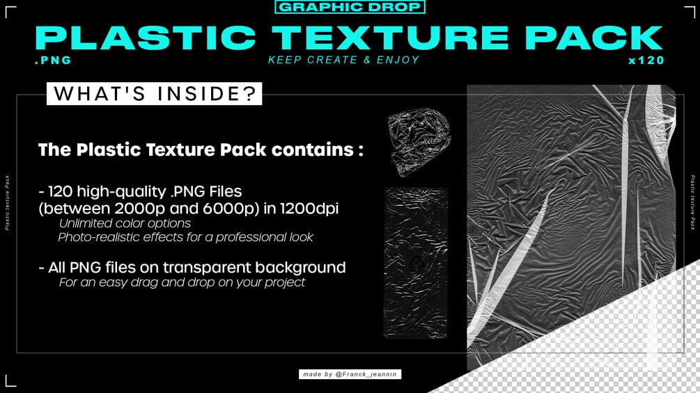 The Plastic Texture Pack, which includes 120 .PNG files of the highest quality. These plastic textures are perfect for any design project, with their transparent background it's easy-to-use with a simple drag-and-drop.